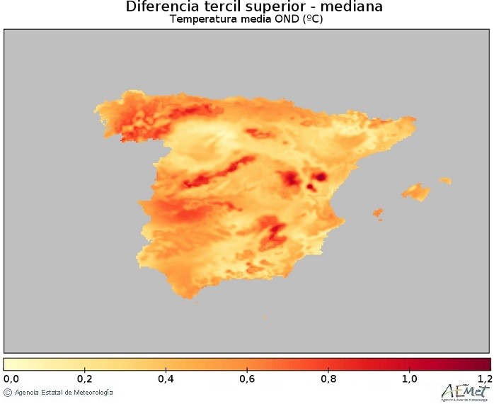 Para el periodo octubre-noviembre-diciembre de 2021 existe una mayor probabilidad de que la precipitación se encuentre en el tercil seco en toda España, con menor probabilidad cuanto más al este, y de que la temperatura media se encuentre en el tercil cálido en toda España, con probabilidades más altas cuanto más al este, considerando el periodo de referencia 1981-2010. Eso supone que en la península y Baleares esa temperatura media trimestral estará, al menos, 0,6ºC por encima de lo normal, aunque en algunas zonas ese valor va a ser superior.