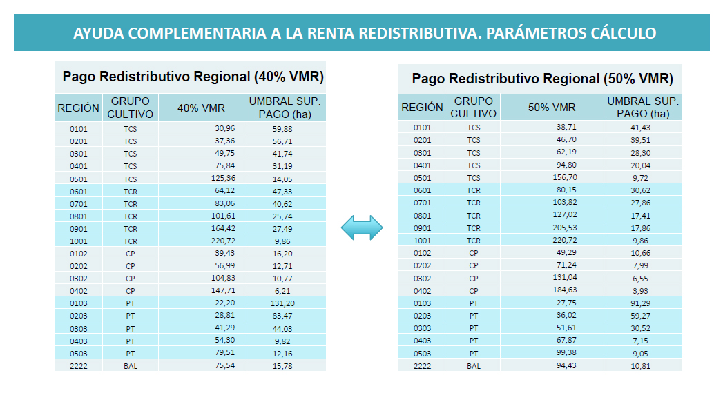 -Cuantía: Importe 40-50 % del valor medio regional, hasta un límite igual al valor del pago medio nacional por hectárea de las ayudas directas. El importe de la ayuda complementaria redistributiva aplicable a cada región será igual a un sexto del importe de la ayuda básica a la renta asignado a dicha región.