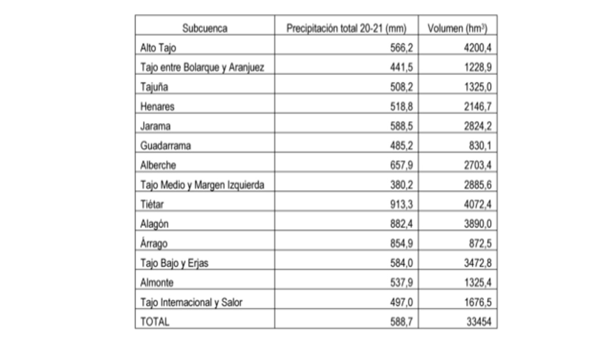 Por subcuencas, en la demarcación hidrográfica del Tajo se registraron en el periodo citado las siguientes precipitaciones: