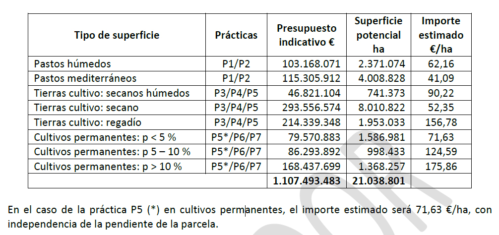 El importe estimado irá de los 41,09 euros/hectárea para los pastos mediterráneos hasta los 175,86 para los cultivos permanentes con una pendiente superior al 10 %. El importe estimado se ha calculado previendo que, en 2023, el 70 % de la superficie potencial se acoge a alguna práctica.