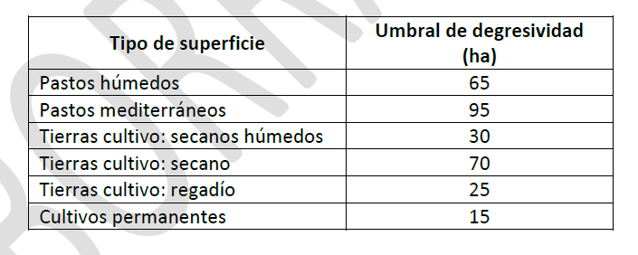 Los importes estimados corresponden al importe medio esperado en cada tipo de superficie para el grado de acogida previsto. No obstante, para tener en cuenta el coste de transacción asociado al cambio que supone aplicar una práctica, se aplicará un importe superior en las primeras hectáreas de cada explotación, hasta los umbrales recogidos en la tabla siguiente, a partir de los cuales se recibirá el 70% del importe aplicado en la superficie por debajo del umbral.