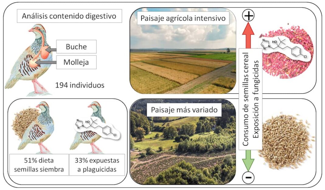 Los resultados revelaron que las semillas de siembra constituían la mitad de la dieta ingerida por las perdices (50,7%). Además, cabe destacar que estas aves consumieron mayoritariamente semillas de cereales de invierno como el trigo o la cebada (42,3% de la dieta). Por otro lado, los resultados mostraron que el 33,0% de las aves analizadas estaban expuestas a diferentes plaguicidas, detectando la presencia de siete fungicidas y un insecticida en el contenido digestivo. El fungicida tebuconazol fue el plaguicida más destacado, estando presente en el 19% de los individuos. Asimismo, se demostró que la presencia de estos plaguicidas en el contenido digestivo estaba directamente relacionada con el consumo de semillas de cereales de invierno, apuntando al consumo de semillas tratadas como una importante ruta de exposición a plaguicidas para aves granívoras que habitan en ambientes agrícolas.