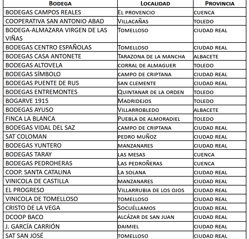 Acuden al evento un total de 25 bodegas, inscritas para la ocasión, siendo, de las cuatro provincias que comprenden la DO La Mancha, la de Ciudad Real la mayoritaria (15) seguida de Toledo (5), Cuenca (3) y por último, Albacete (2).