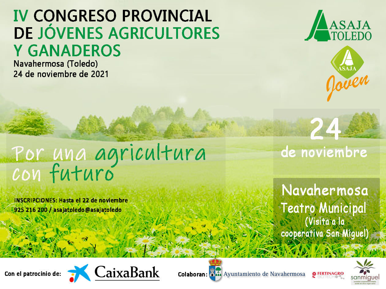 ASAJA Toledo celebrará el próximo 24 de noviembre, miércoles, su IV Congreso Provincial de Jóvenes Agricultores y Ganaderos, en el Teatro Municipal de Navahermosa, bajo el lema «Por una agricultura con futuro». El congreso incluirá una visita a la cooperativa San Miguel.