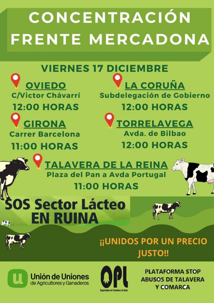 Las concentraciones se realizarán frente al Mercadona de Girona situado en Carrer Barcelona, a las 11:00 horas; en Oviedo en la Calle Víctor Chávarri a las 12:00 horas; en Torrelavega en Avenida de Bilbao a las 12:00 horas; en La Coruña convocada por la Plataforma Galega en defensa do Leite, frente a la Subdelegación de Gobierno a las 12:00 horas y en Talavera de la Reina se llevará a cabo una tractorada desde Plaza del Pan al Mercadona ubicado en Avenida Portugal a las 11:00 horas.