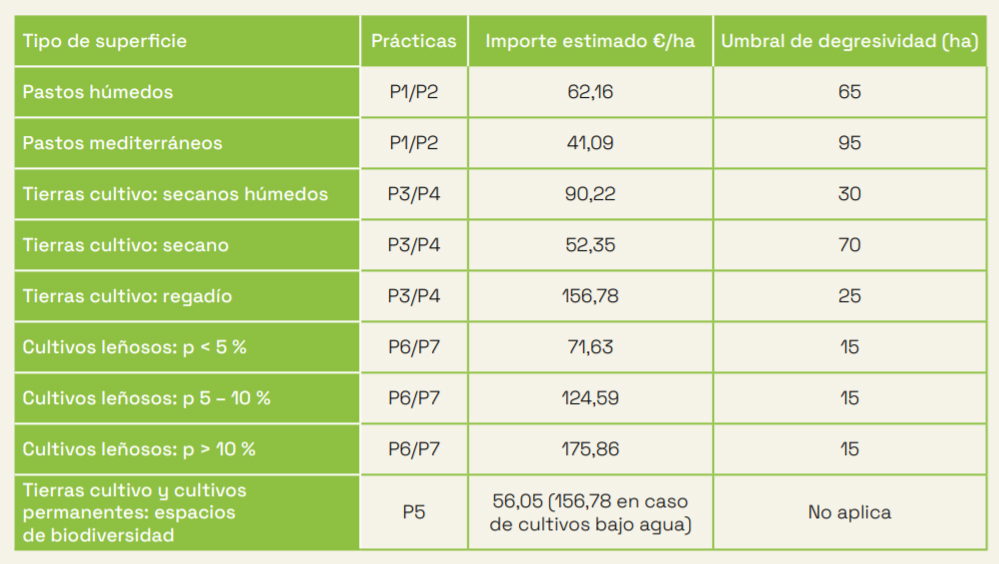 En relación a los importes, para un mismo tipo de superficie, el importe esperado de la ayuda recibida por hectárea es el mismo con independencia de la práctica que se realice, salvo en el caso de la práctica P5.