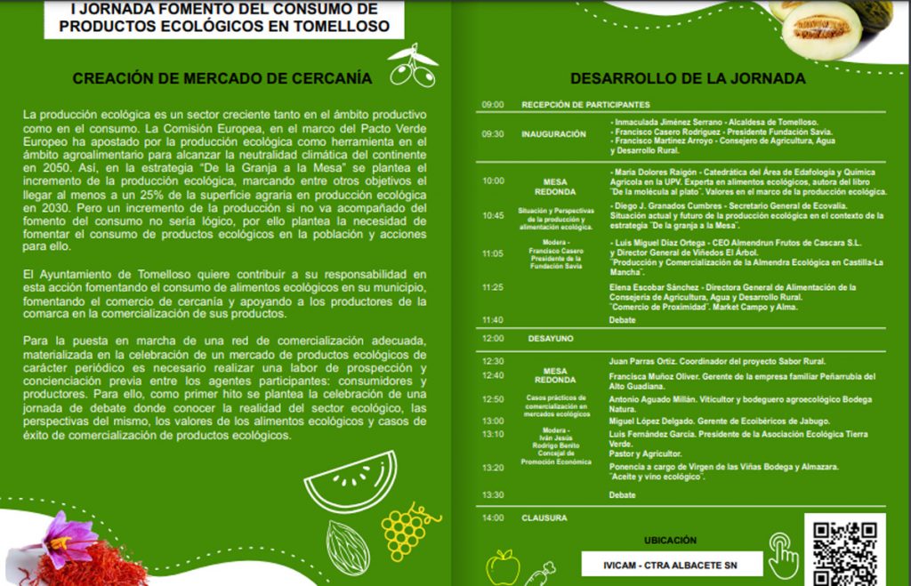 El Ayuntamiento de Tomelloso (Ciudad Real) ha organizado para el miércoles 12 de enero la ‘I Jornada de Fomento del Consumo de Productos Ecológicos en Tomelloso’ que se celebrará en las instalaciones del Instituto Regional de Investigación y Desarrollo Agroalimentario y Forestal de Castilla-La Mancha (IRIAF). Inscripciones aquí