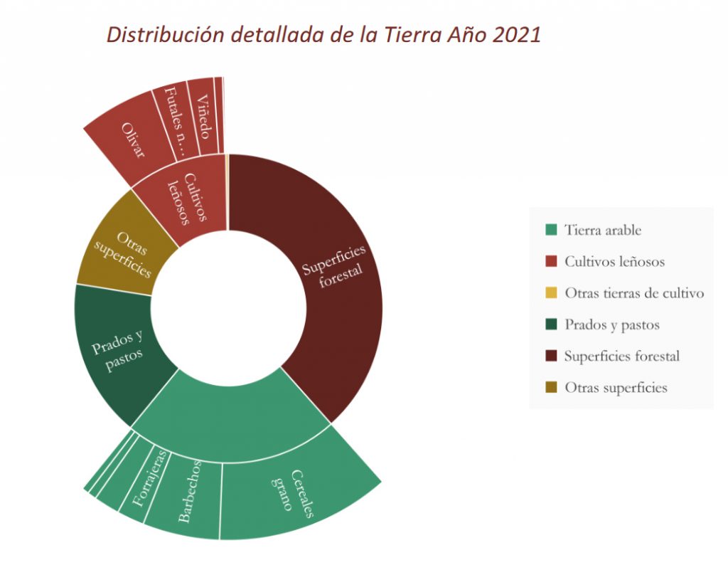 Los resultados de Esyrce 2021 muestran una gran estabilidad, con un leve incremento de la superficie dedicada a la producción de cereales grano (6,17 millones de hectáreas, un 1,78 % más que en 2020) y a cultivos leñosos (5,3 millones ha, +0,44 %), mientras que las áreas en barbecho bajaron un 6,54 % (2,60 millones ha).