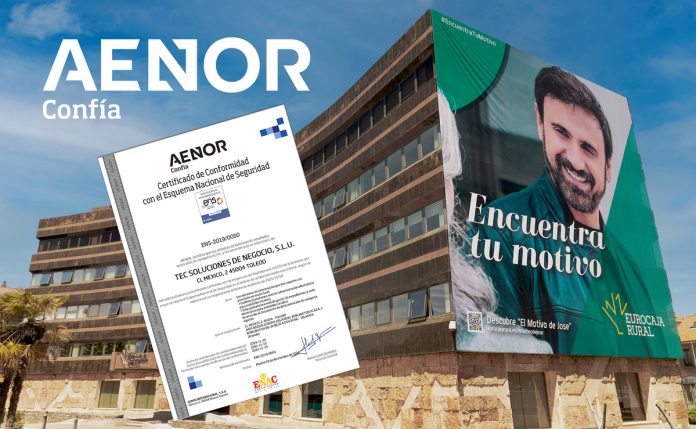 TEC Soluciones de Negocio SLU, del Grupo Eurocaja Rural, ha recibido la renovación durante dos años más del Certificado de Conformidad con el RD 3/2010 – Esquema Nacional de Seguridad (ENS) otorgado por AENOR, en virtud de su compromiso con la calidad y seguridad del servicio que proporciona a través de los sistemas de información Giaweb y SIAE, ambos con categorización: ALTA, la máxima posible.