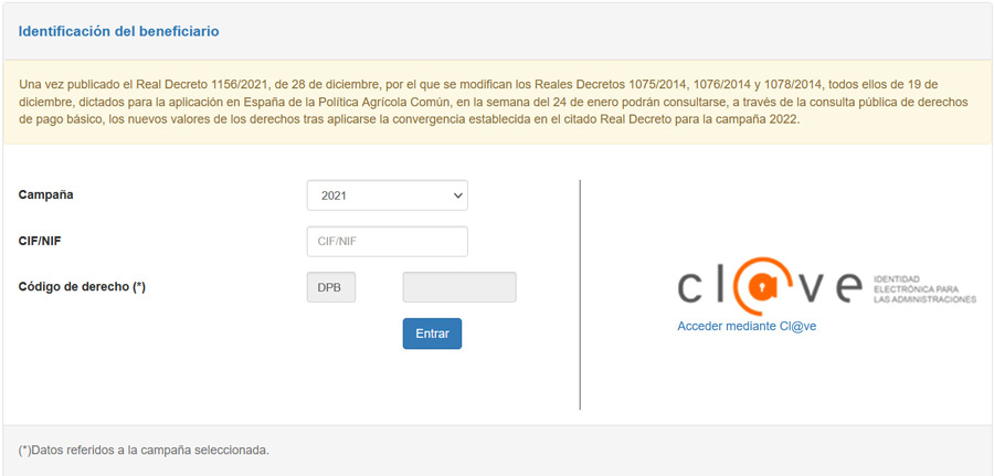 Para acceder a la consulta se debe introducir la campaña PAC consultada; el CIF/NIF y el código de derecho.