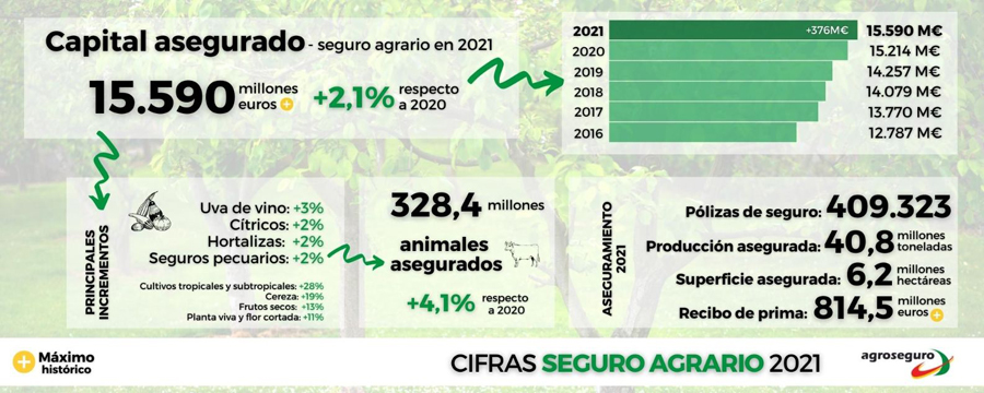 En concreto, el capital asegurado por el seguro agrario marca un nuevo máximo histórico (por séptimo año consecutivo) y crece un 2,1% hasta los 15.590 millones de euros registrados en 2021. Esto supone que el valor de la producción agrícola y ganadera protegida por el seguro agrario se ha incrementado en más de 376 millones de euros.