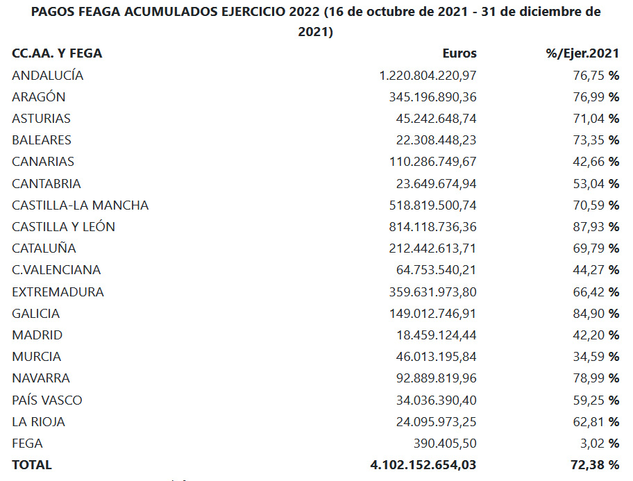 Los pagos de la Política Agraria Común (PAC) con cargo al Fondo Europeo Agrícola de Garantía Agraria (Feaga) del 16 de octubre al 31 de diciembre de 2021 sumaron 4.102,15 millones de euros, el equivalente al 72,38 % de las ayudas que percibieron en el total del ejercicio anterior.