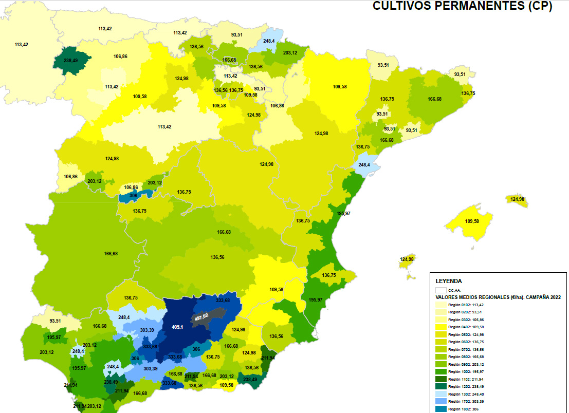 Con base en los puntos anteriores, se presenta la distribución geográfica en 2022 de los valores medios regionales de las regiones del régimen de pago básico en España, diferenciándose los mapas en función de la orientación productiva de las regiones: