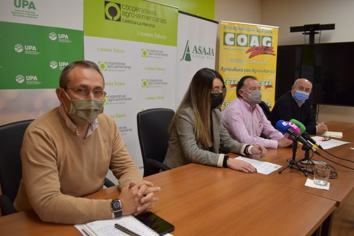 Los responsables de las organizaciones agrarias, el secretario general de ASAJA Ciudad Real, Florencio Rodríguez; Victoriano Alhambra, de la Junta Directiva de COAG-IR CLM; Cristina Monreal, de la ejecutiva de UPA, y el director de Cooperativas Agro-alimentarias Castilla-La Mancha, Juan Miguel del Real, vuelven a alzar la voz conjuntamente para reivindicar un decálogo “de mínimos”, cuyo primer punto lo encabeza trabajar por “unos precios de los productos agrarios que permitan la sostenibilidad económica de las explotaciones agrícolas y ganaderas, en línea con lo que establece la ley de la cadena alimentaria”, señala Rodríguez. Una reivindicación que exige un plan de choque que ayude a paliar los negativos efectos del incremento de los costes de producción que está sufriendo el sector agroalimentario. Este sería el segundo punto del decálogo exigido.