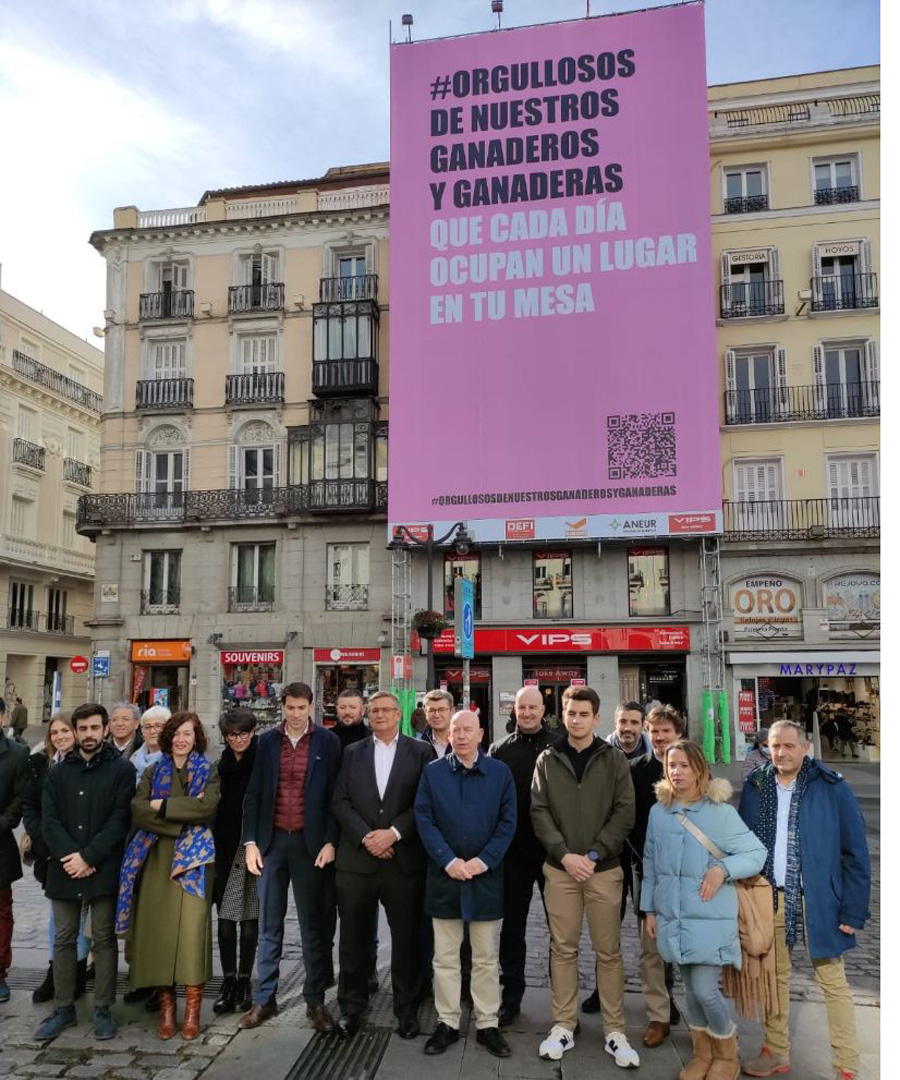 Para ello, la Interprofesional del Porcino de Capa Blanca (INTERPORC) ha desplegado una lona de 254 m2 en la Puerta del Sol de Madrid que, bajo el lema ‘Orgullosos de nuestros ganaderos y ganaderas’, pretende llamar la atención de la sociedad urbana para trasladarle la realidad del medio rural y el papel de los profesionales del sector.