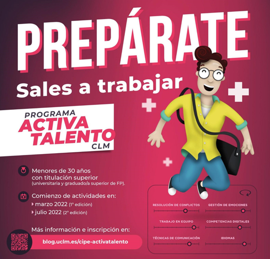 La Universidad de Castilla-La Mancha (UCLM) ha lanzado un nuevo programa de formación gratuito, presencial y en línea, que pretende propiciar el acceso al mercado laboral a los más jóvenes. La iniciativa se denomina #ActivaTalento y está dirigida a menores de treinta años con titulación universitaria o un grado superior de Formación Profesional, inscritos en el Sistema de Garantía Juvenil y empadronados en Castilla-La Mancha.