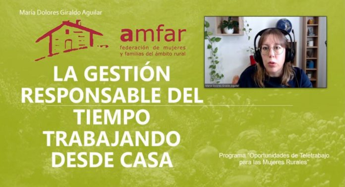 La Federación de Mujeres y Familias del Ámbito Rural (AMFAR) ha impartido este miércoles la segunda sesión del programa “Oportunidades del Teletrabajo para las Mujeres Rurales” a través de un webinar gratuito en el que se ha abordado “La gestión responsable del tiempo trabajando desde casa”.
