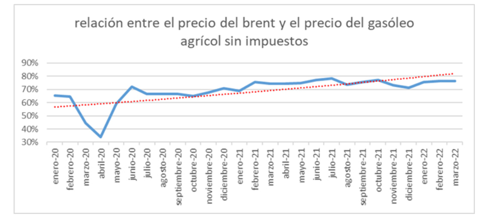 UPA asegura que la idea de que la subida de los combustibles es sólo culpa de Putin y la guerra en Ucrania es “directamente falsa”. Analizando la relación entre el precio del petróleo y el precio del gasóleo agrícola se observa cómo en los meses en los que la pandemia hizo que disminuyera el consumo de combustibles esta relación llegó al 34-45%, mientras que en la actualidad se sitúa en el 78%.