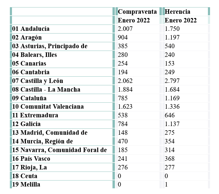 Por Comunidades Autónomas, las herencias superaron a las compraventas en: Castilla y León (2.797), Aragón (1.197), Cataluña (1.169), Galicia (1.137), Extremadura (646), Asturias (540), País Vasco (368), Navarra (314), La Rioja (277) Madrid (275), Cantabria (249), y Melilla (1).