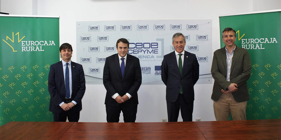 En el acto han estado presentes el presidente de Eurocaja Rural, Javier López Martín, acompañado del director territorial de Eurocaja Rural en Cuenca, José Manuel Poyatos Cabrera, y el presidente de CEOE CEPYME Cuenca, David Peña López, acompañado del director del Departamento Económico de CEOE CEPYME Cuenca, Miguel Angel Santos.
