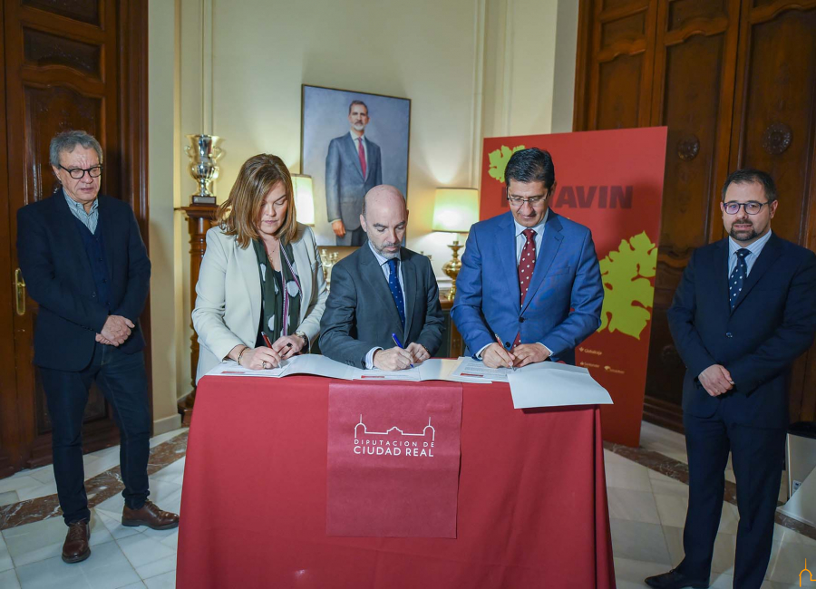 La Feria Nacional del Vino ha recuperado, a falta de dos semanas para su apertura, toda su trascendencia. Prueba de ello es la reciente firma del convenio entre el presidente de la Diputación de Ciudad Real, José Manuel Caballero, y los representantes del Banco Santander, Lorena Ruiz, directora de negocio de Agro Santander España, y Miguel Ángel Franco, director territorial de la entidad bancaria en Castilla-La Mancha.