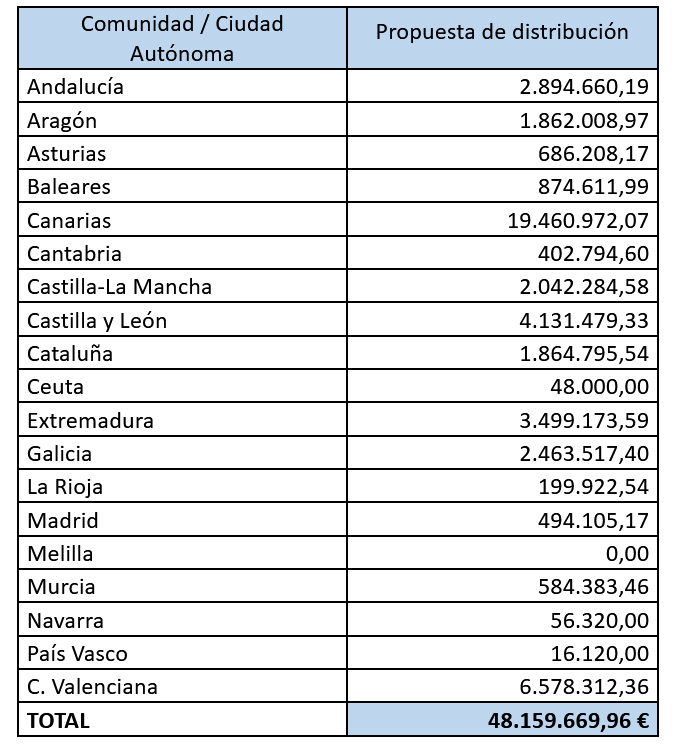 El siguiente cuadro recoge el reparto por comunidades autónomas: