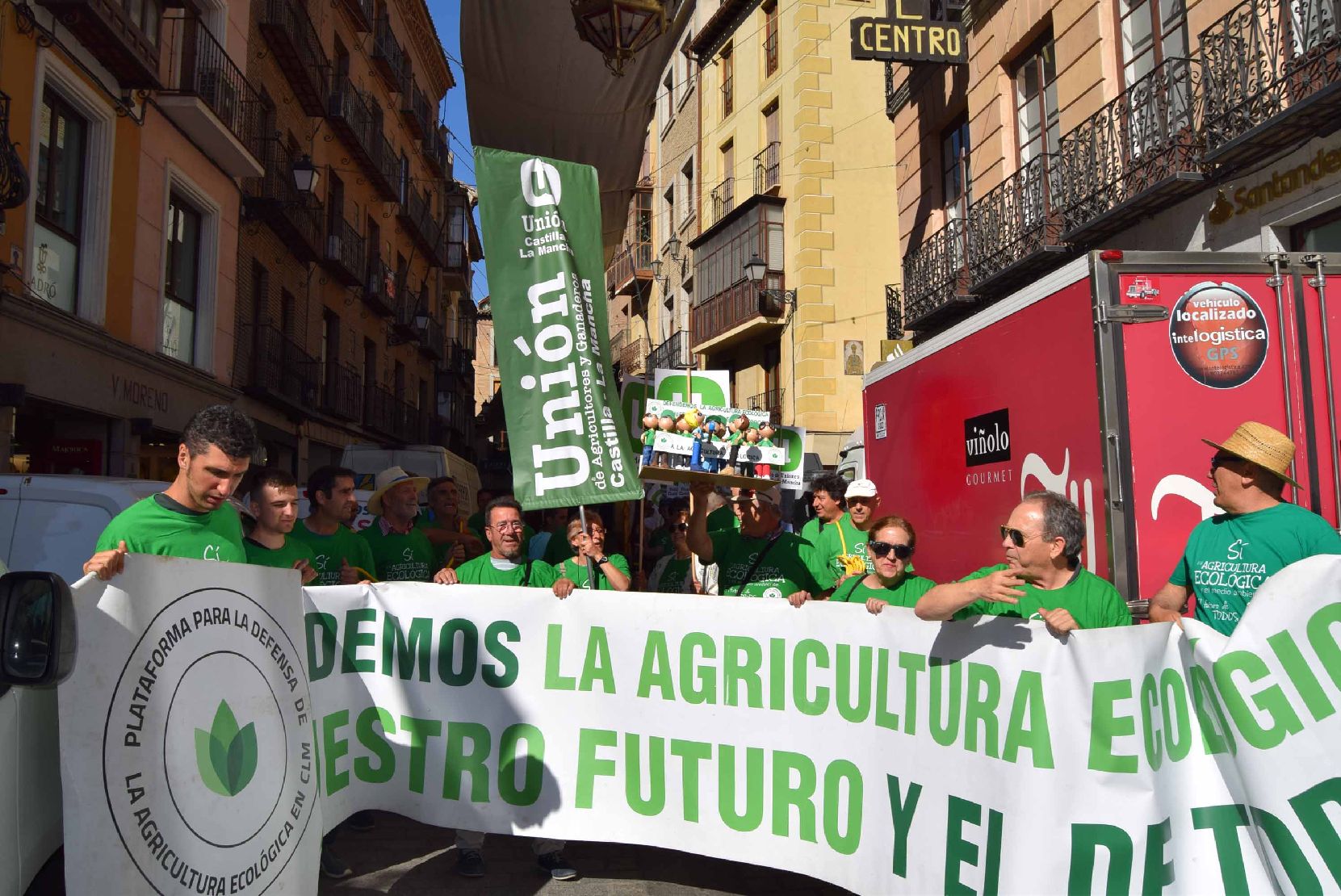 Unión de Uniones de Castilla-La Mancha, junto a la Plataforma en Defensa de la Agricultura y Ganadería Ecológica en Castilla-La Mancha, han salido este martes a las calles de Toledo “con 500 millones de euros en razones para manifestarnos en contra de la política agraria del presidente de la Junta, Emiliano García-Page”, señalaba uno de los portavoces de la plataforma, Anastasio Yébenes, durante el transcurso de la misma.