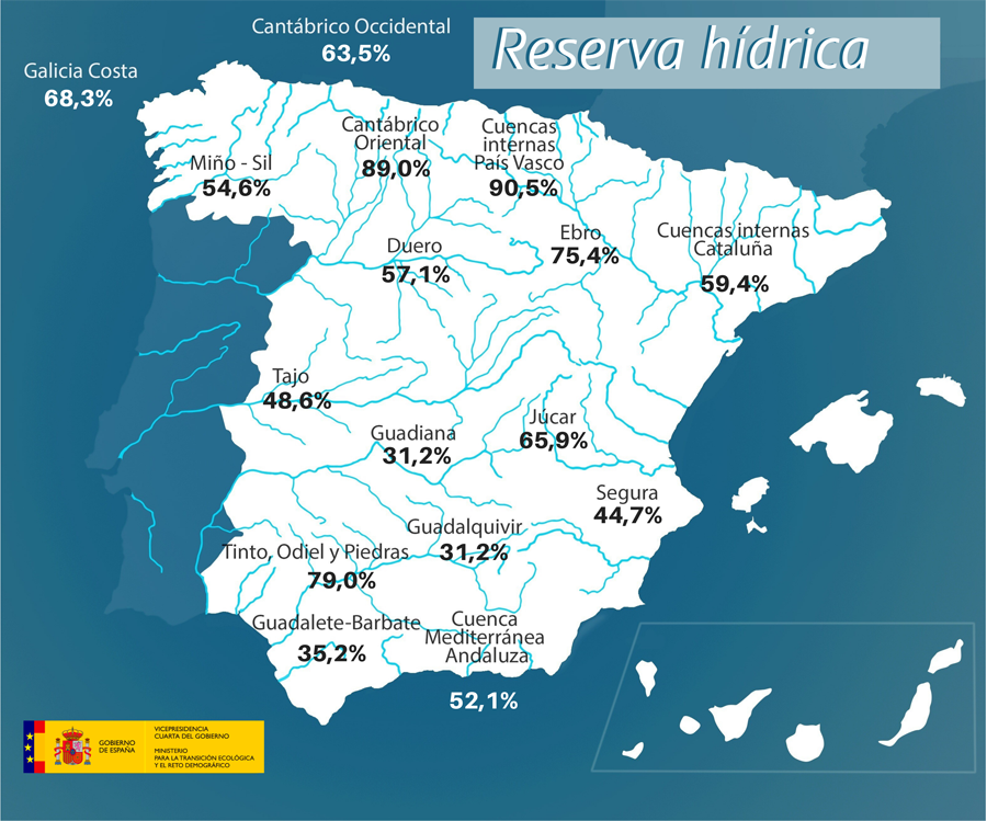 La reserva hídrica española está al 49,5 por ciento de su capacidad total. Los embalses almacenan actualmente 27.814 hectómetros cúbicos (hm³) de agua, disminuyendo en la última semana en 291 hectómetros cúbicos (el 0,5 por ciento de la capacidad total actual de los embalses).