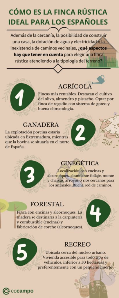 Todo esto hará la finca rústica ideal, aunque según la tipología (agrícola, ganadera, cinegética, forestal o de recreo), variarán los aspectos a tener en cuenta para que sea realmente el terreno ‘perfecto’.