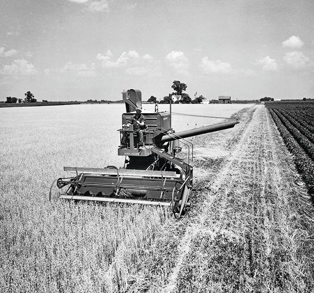 En 1947, John Deere lanzó el modelo 55, la primera cosechadora autopropulsada, que se considera el precursor de las cosechadoras de hoy en día. Esta fue la respuesta de la empresa ante el avance de la mecanización en la agricultura. En los años siguientes, John Deere se concentró principalmente en máquinas con auto nivelación, como las combinaciones de 55H Hillside, que permitían obtener los mejores resultados de trilla incluso en terrenos exigentes. Con el paso del tiempo, las cosechadoras evolucionaron para ayudar a los agricultores a recolectar en menos tiempo y con mayor eficiencia.