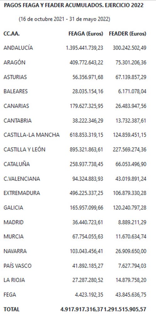 Los pagos Feaga relativos únicamente al mes de mayo de 2022 ascendieron a 125,91 millones de euros y, de ellos, los más importantes fueron los de las líneas Poseican (45,72 millones), Ayuda Asociada Voluntaria (39,24 millones) y el Régimen de Pago Básico (13,26 millones).