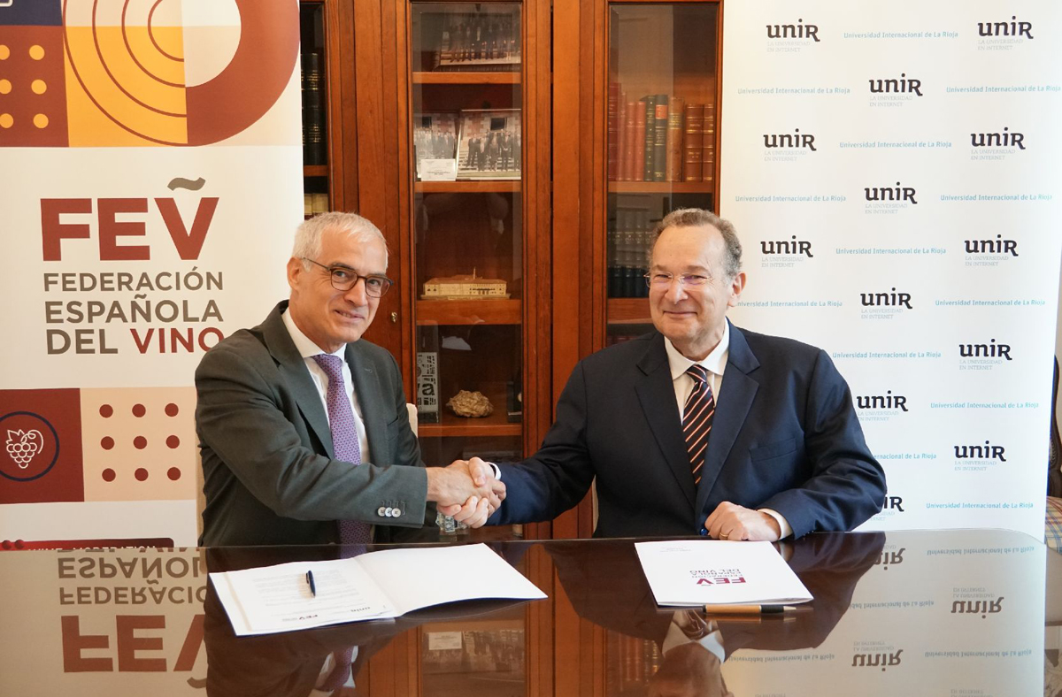 La Universidad Internacional de la Rioja (UNIR) y la Federación Española del Vino (FEV) han firmado este jueves un acuerdo marco para impulsar la formación, la investigación, la transferencia tecnológica, el asesoramiento técnico especializado y el intercambio de experiencias en diferentes áreas relacionadas con la gestión del mundo del vino.