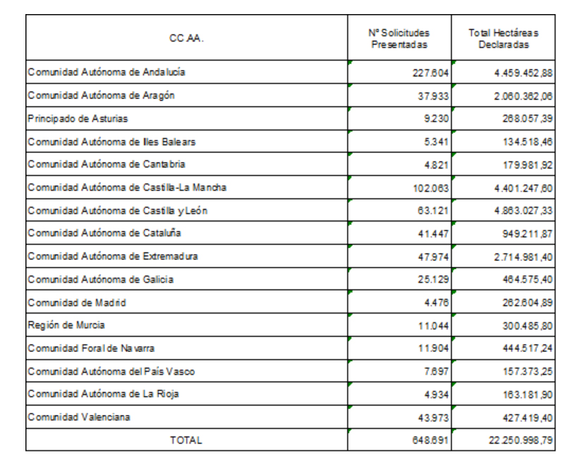 En la página web del FEGA se puede consultar toda la información sobre el número de solicitudes presentadas en las diferentes comunidades autónomas y el resumen de los cultivos declarados. En la siguiente tabla se indican, como resumen de toda la información, las solicitudes presentadas y la superficie declarada por comunidad autónoma.