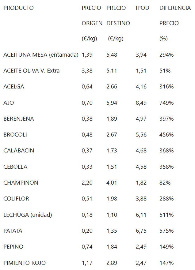 Con los datos de junio, el IPOD general o número de veces que se multiplica el precio de origen hasta que llega al consumidor se sitúa en 4,24, una cifra que sube a 4,60 para los productos agrícolas y baja al 2,79 para los ganaderos.