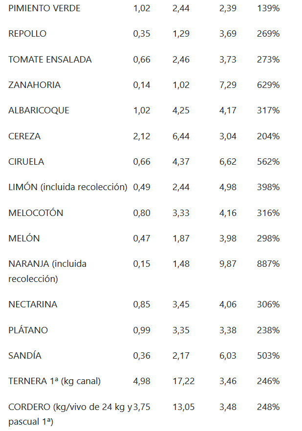 También sufren grandes variaciones de precio del campo a la mesa el ajo (749 %), la zanahoria (629 %), la patata (575 %), la ciruela (562 %), la lechuga (511 %), la sandía (503 %), el brócoli (456 %) o el limón (398 %).