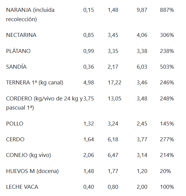 El precio que cobra un agricultor o un ganadero se multiplica casi por diez para algunos alimentos frescos, como es el caso del kilo de naranjas, que en el campo se paga a 0,15 euros, mientras que el consumidor lo compra en la tienda a 1,18 euros, lo que supone multiplicar por 9,87 su cotización inicial.