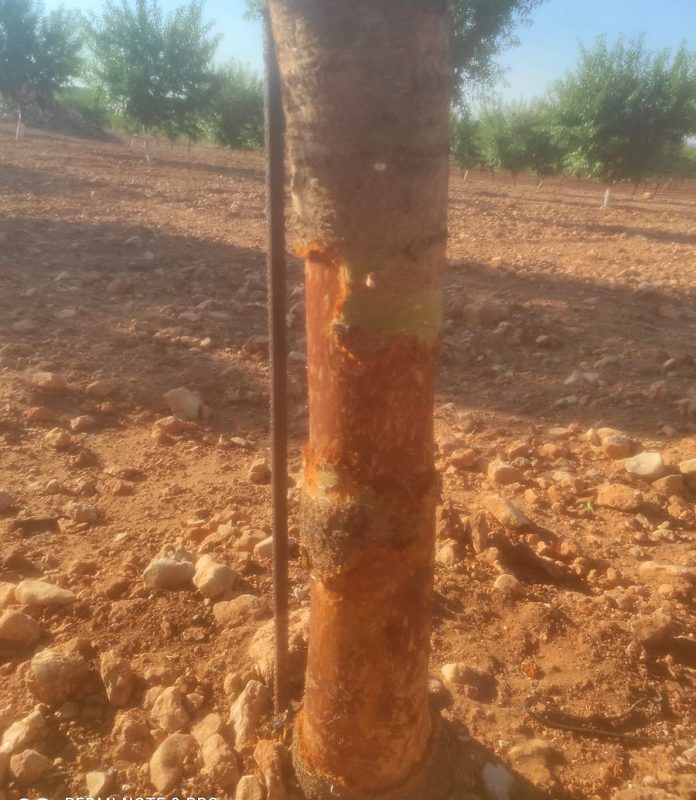 Eduardo, socio de la organización agraria muestra en unas fotografías como los animales pelan los troncos de sus almendros, de siete años, ubicados en El Peral.