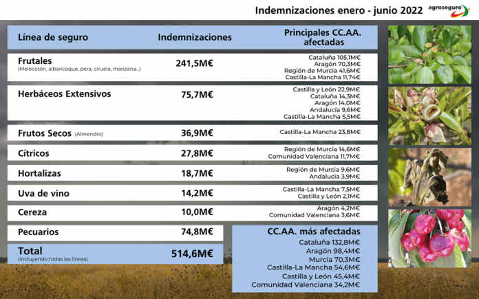El primer semestre del año 2022 termina con una estimación de indemnizaciones de 514,67 millones de euros, la más alta del seguro agrario. Este resultado supone un 12% más que lo registrado entre enero y junio de 2021 (458 millones) y un 25% más que en 2020 (353 millones). Ello constata, de nuevo, el aumento de los fenómenos meteorológicos cada vez más adversos y graves durante la última década, y muy especialmente desde 2017, resultando en ratios de siniestralidad por encima del equilibrio en cinco de los últimos seis años.