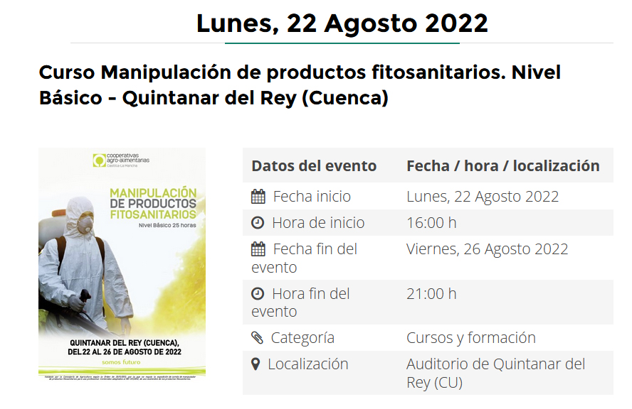 Inicio Formación y Cursos 22-agosto-2022. Curso de manipulación de productos fitosanitarios. Quintanar del Rey (Cuenca)