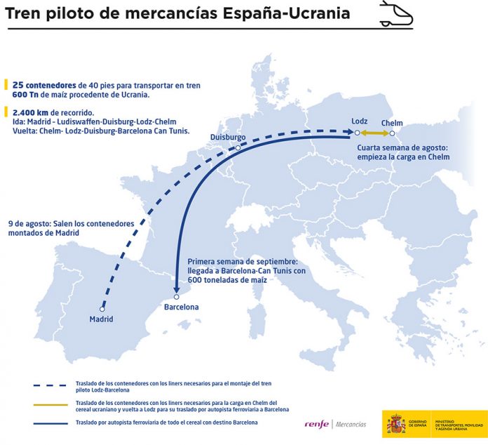 El Ministerio de Transportes, Movilidad y Agenda Urbana (Mitma) ha puesto en marcha el proyecto piloto para transportar grano en tren desde Ucrania hasta España como alternativa o complemento al modo marítimo en un momento marcado por la invasión de Rusia y las limitaciones en los puertos del Mar Negro.
