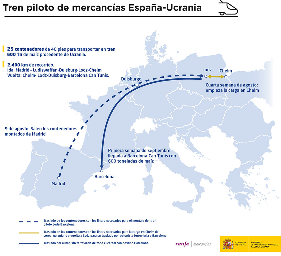 Los primeros pasos de este proyecto piloto coinciden con la reapertura de los puertos del Mar Negro y las rutas marítimas cerealeras supervisadas por Turquía, por lo que el viaje de prueba se hará con 600 toneladas (Tn) de maíz, un volumen menor a la inicialmente comprometida, pero igualmente importante para comprobar de la viabilidad de una solución ferroviaria liderada por España como apoyo al transporte marítimo.