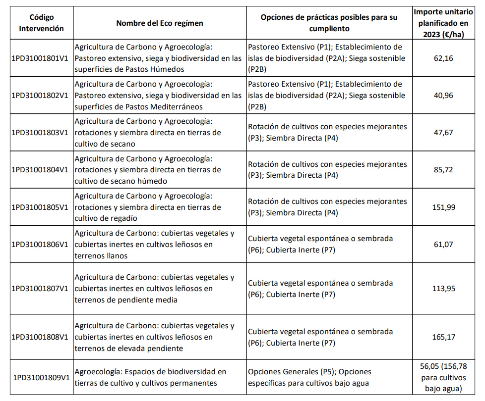 Como se recoge en la tabla, la ayuda se percibirá en cada hectárea que se solicita si se realiza, al menos, una de las prácticas descritas para el eco régimen en cuestión, siendo sólo posible el cobro de una ayuda por cada hectárea que se solicite, independientemente de que se realice más de una práctica sobre la misma hectárea.