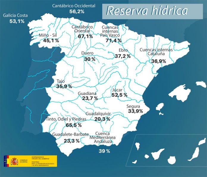 La reserva hídrica española está al 32,5 por ciento de su capacidad total. Los embalses almacenan actualmente 18.270 hectómetros cúbicos (hm³) de agua, disminuyendo en la última semana en 540 hectómetros cúbicos (el 1 por ciento de la capacidad total actual de los embalses).
