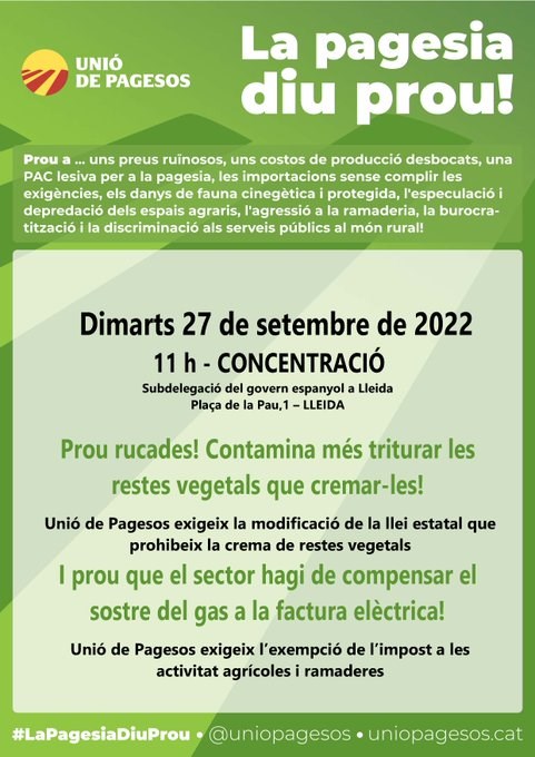 Unió de Pagesos ha convocado al sector agrario a una concentración de protesta para este martes, 27 de septiembre, en la Subdelegación del Gobierno español de Lleida.