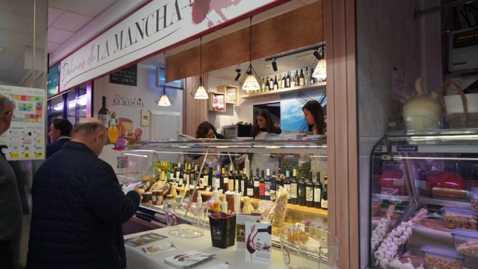 Delicias de La Mancha cuenta con un espacio de 18 m2 donde se ofertan 39 marcas de vino de 22 bodegas distintas acogidas a la Denominación de Origen La Mancha a disposición en venta directa en el puesto nº 2 del mercado de Argüelles de la capital madrileña.