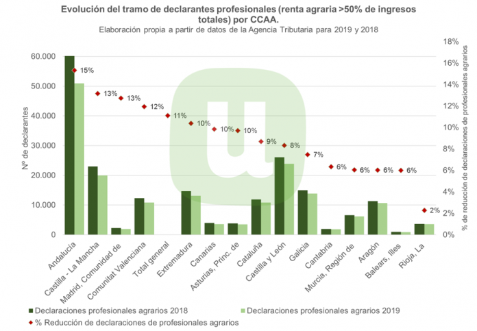 A nivel estatal, los tramos profesionales (más del 50% de ingresos totales procedentes de la actividad agraria) se habrían reducido en un 11,1% respecto de 2018; una tónica con la misma tendencia se habría dado en las CC.AA: Andalucía (reducción del 15% de declaraciones de estratos profesionales), Madrid (13%), Castilla-La Mancha (13%), Comunitat Valenciana (12%), o Extremadura (10%), si bien esta tendencia es generalizada en todas las autonomías.