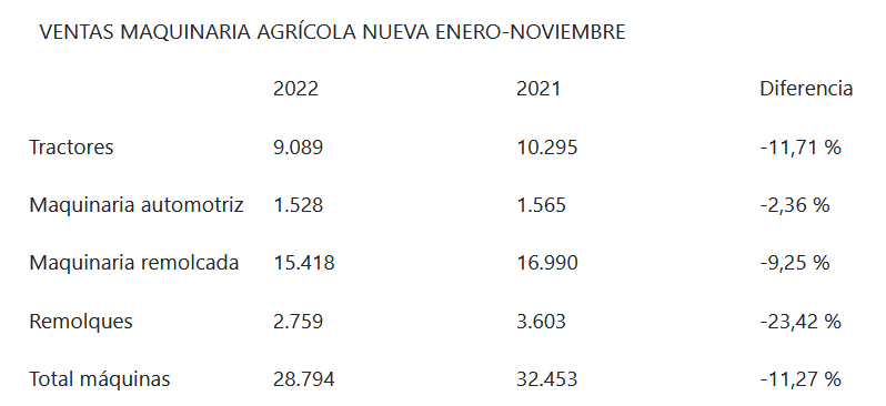 La venta de maquinaria agrícola nueva en España ha alcanzado las 28.794 unidades entre enero y noviembre de este año, lo que supone un retroceso del 11,27 % respecto al mismo período de 2021.