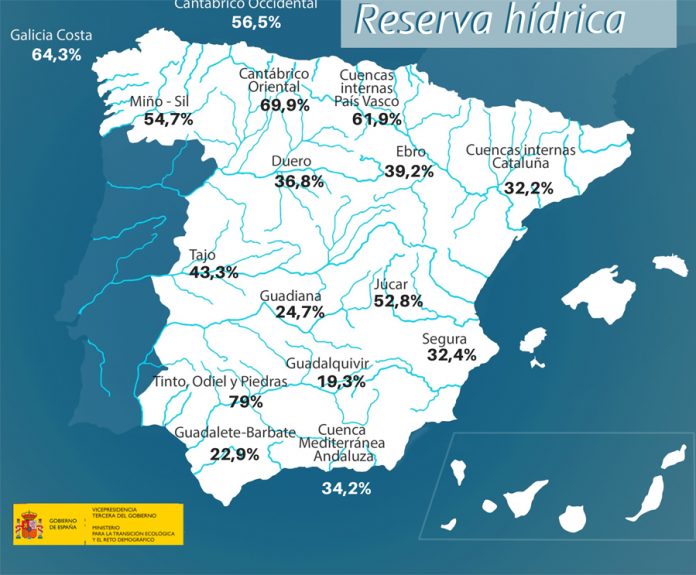 La reserva hídrica35,7 española está al 35,7 por ciento de su capacidad total. Los embalses almacenan actualmente 20.021 hectómetros cúbicos (hm³) de agua, aumentando en la última semana en 765 hm³ (una variación del 1,4 por ciento de la capacidad total actual de los embalses).