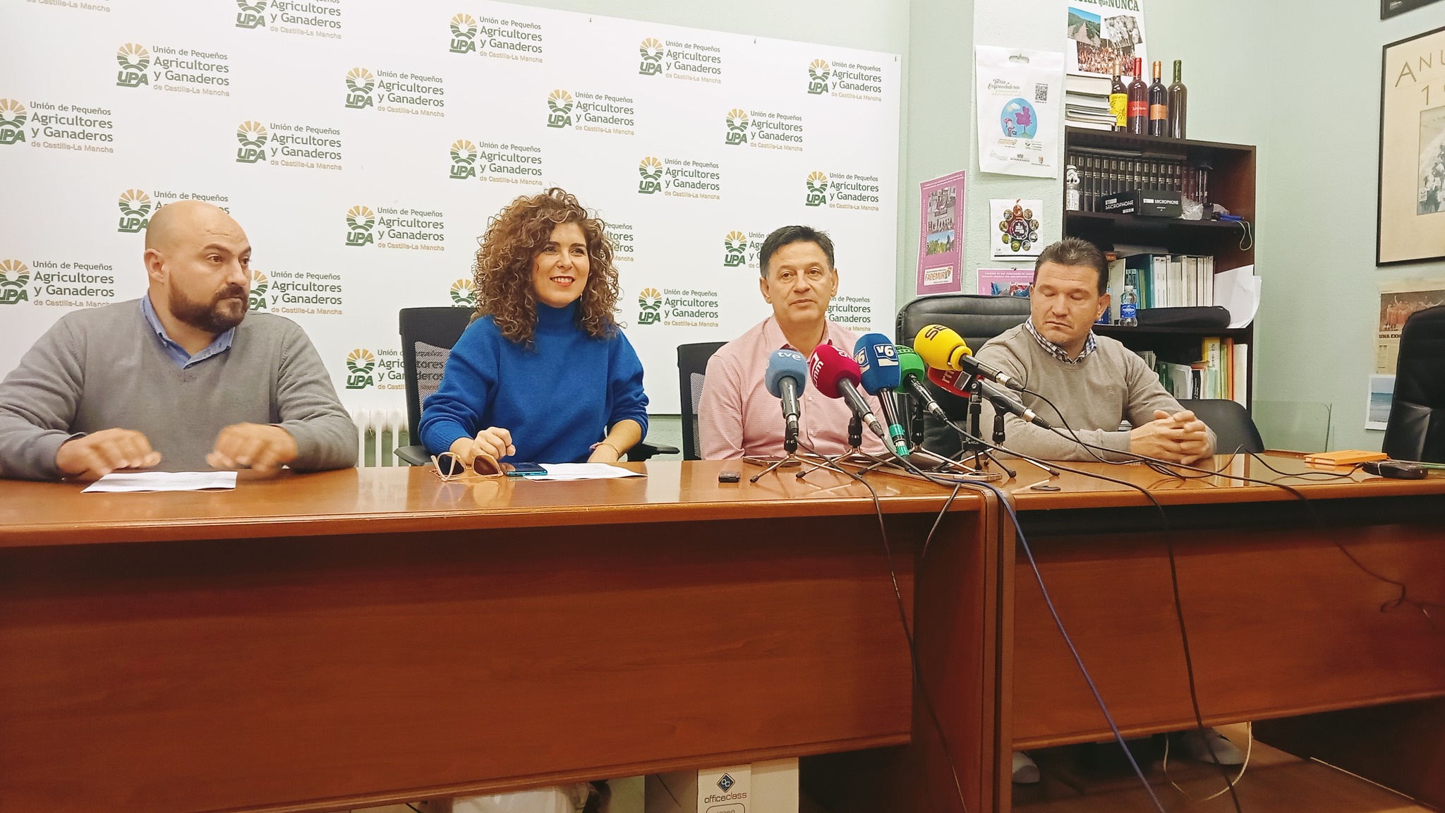 El secretario general de UPA Castilla-La Mancha, Julián Morcillo, acompañado de Pedro González, responsable de Seguros de UPA CLM; Mariluz Fresneda, responsable de FADEMUR en Albacete; Ricardo Ortega, presidente de ASAPA Albacete, y José Joaquín Fernández, presidente de Bodegas Santa Cruz de Alpera, ha hecho balance de lo que ha calificado como un año “complicado” para el sector.
