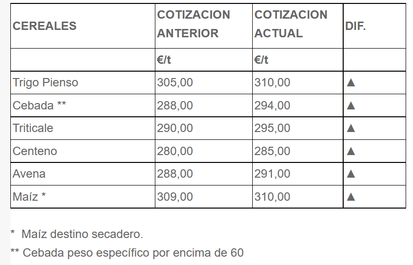 Así la cebada ha subido 6 euros por tonelada; trigo, triticale y centeno 5 euros tonelada; 3 euros la avena y 1 el maíz.